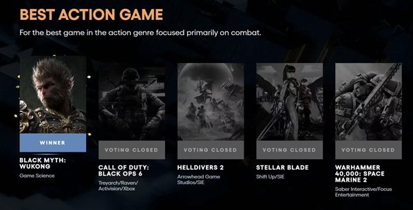 本日,有游戏界“奥斯卡”之称的TGA(The Game Awards)公布2024年度评奖收尾,由游戏科学开采制作的国产3A游戏《黑传奇:悟空》赢得最好动作游戏奖和玩家之声奖,无缘年度最好游戏。